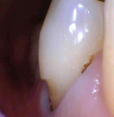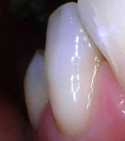 This patient complained of sensitivity to sweets and cold drinks along her gums. Turns out that a significant amount of enamel had broken down along the gum line. Combined with gum recession, her tooth's root surface was exposed, causing the sensitivity. Our Los Gatos dentist bonded a tooth-colored filling on her tooth and polished it in order to blend with the natural tooth. Not only did this bonding protect the tooth from sensitivity, so she could enjoy her favorite foods again, but it also improved the cosmetic appearance!