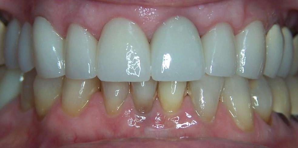 Over the last few years, this lovely Los Gatos patient felt her teeth were aging her. She could not smile because it would show her receding gums along the edges of her crowns. Furthermore, these old crowns have started to appear yellow in color and detract from her smile. She was hesitant at first, but finally decided to whiten her teeth and proceed with replacing eight units of crowns and bridges. She wishes she did this earlier!
